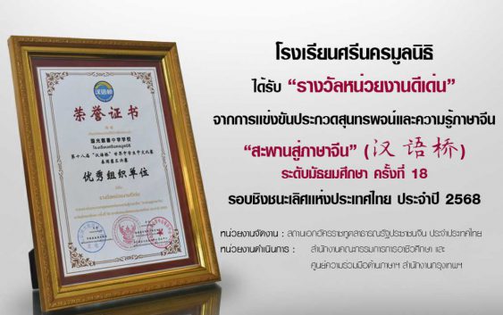 รางวัลหน่วยงานดีเด่น Posted on October 16, 2025 by Koi B. Related Post ประดิษฐ์ริบบิ้นไว้อาลัย พงศ์ภรณ์ มักคุ้น คว้ารางวัสชนะเลิศเทควันโด รางวัล ระดับ “ดีเด่น” จากกิจกรรมการประกวดการเดินสวนสนามยุวกาชาด เข้าค่าย 10-11 ต.ค. 68 กิจกรรมเข้าค่าย 7-9 ต.ค. 68 โรงเรียนศรีนครมูลนิธิ ได้รับ “รางวัลหน่วยงานดีเด่น” จากการเเข่งขันประกวดสุนทรพจน์เเละความรู้ภาษาจีน “สะพานสู่ภาษาจีน” (汉语桥) ระดับมัธยมศึกษา ครั้งที่ 18 รอบชิงชนะเลิศเเห่งประเทศไทย ประจำปี 2568 หน่วยงานจัดงาน : สถานเอกอัครราชทูตสาธารณรัฐประชาชนจีน ประจำประเทศไทย หน่วยงานดำเนินการ : สำนักงานคณะกรรมการการอาชีวศึกษา และ ศูนย์ความร่วมมือด้านภาษาฯ สำนักงานกรุงเทพฯ